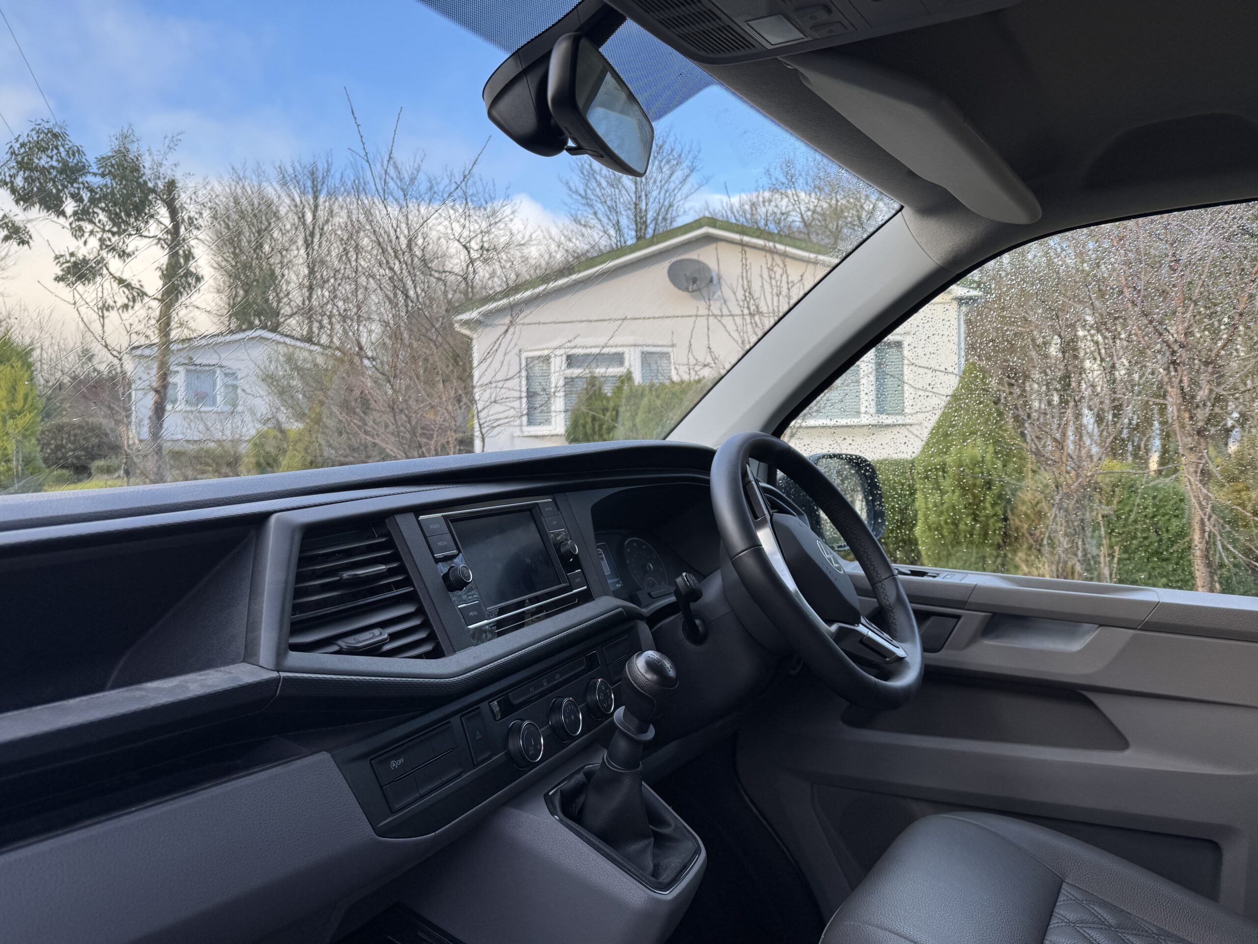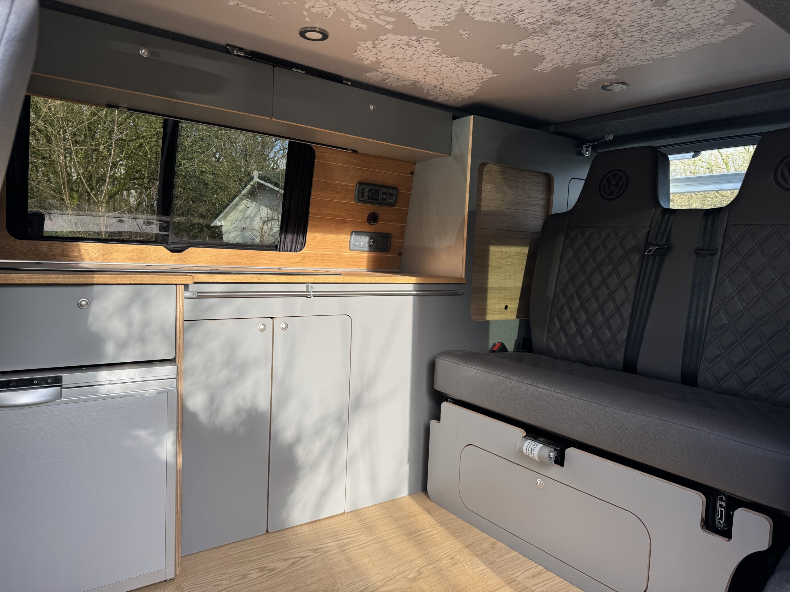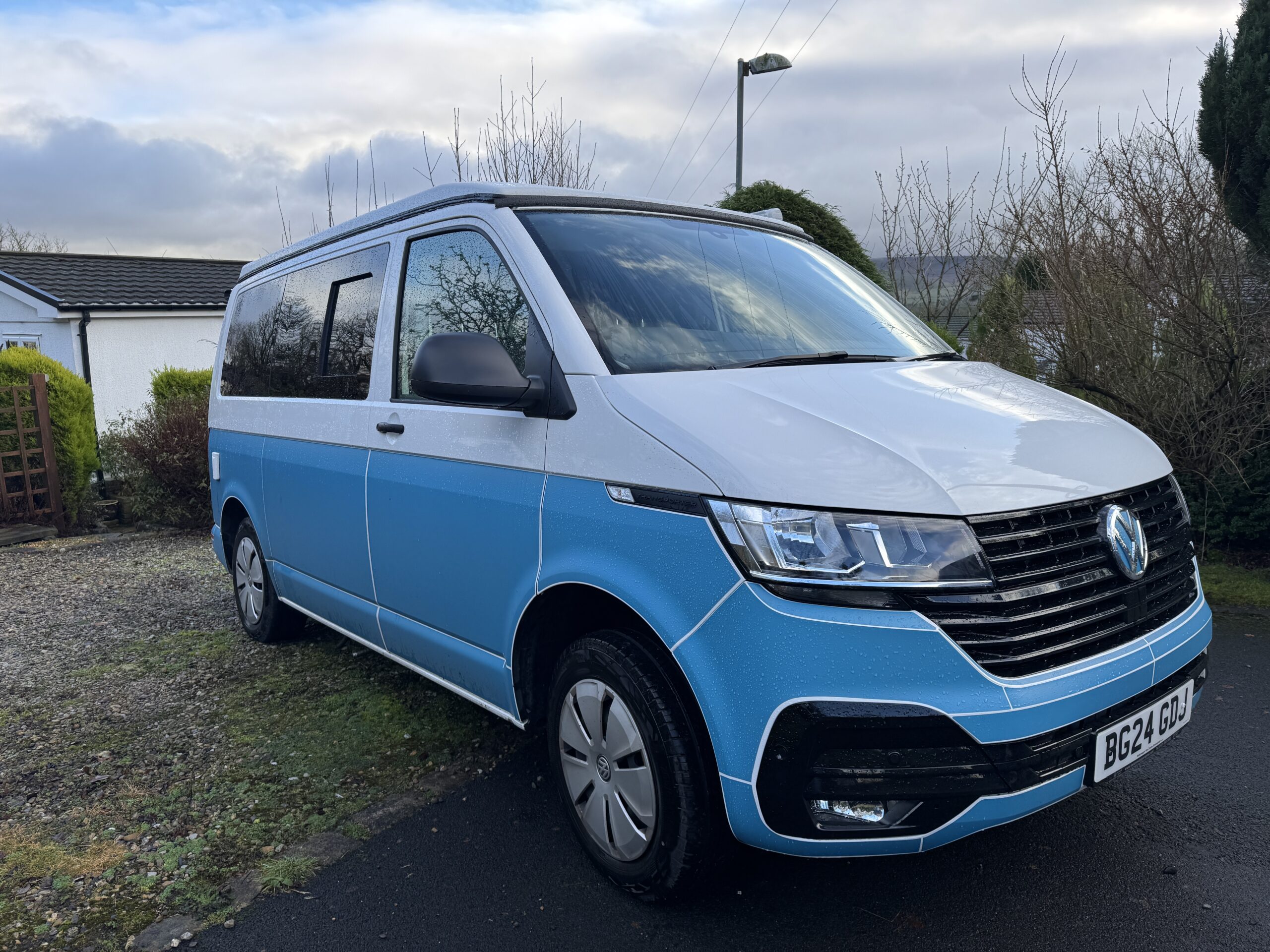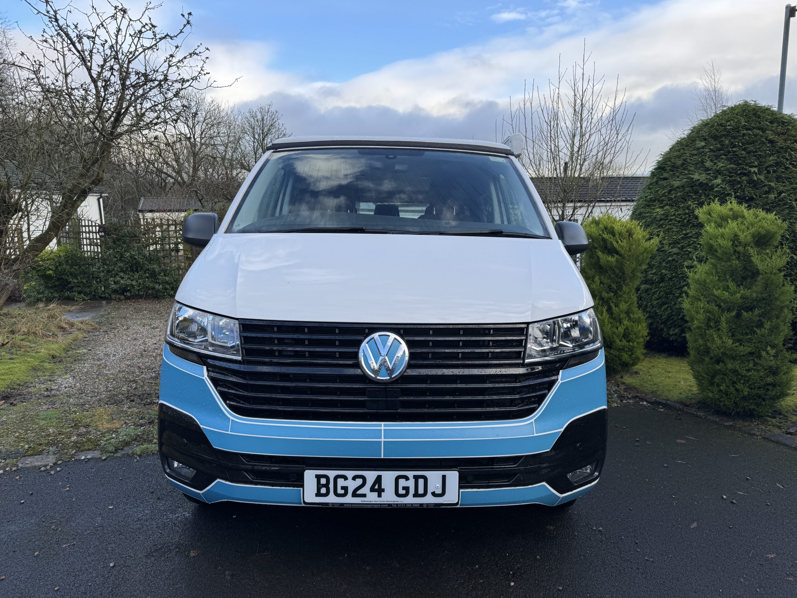 Brand new 2024 T6.1 Startline with business pack campervan 150BHP. This is a ‘Retro style’ Conversion by Goat Roadtrip with tailgate, pop-top roof, leather effect seats (seats 4 in total with seatbelts) , swivel captain’s passenger seat, rock ‘n’ roll bed, roof-bed, scenic opening canvas, webasto diesel heater, double gas hob, fridge/freezer, Smev 9222 sink, leisure battery, solar panel, 240V electric hook-up, removable table, and fresh water bottle tank with electric pump. The exterior is candy white with a head-turning amazing wrap on the lower half. You can even swap out the wrap for another colour in the future or make it completely white again! The interior is matt white with real bamboo wood tops, giving that extra WOW factor. This is a top-spec conversion in a vehicle with air conditioning. Full Service History. Delivery miles.