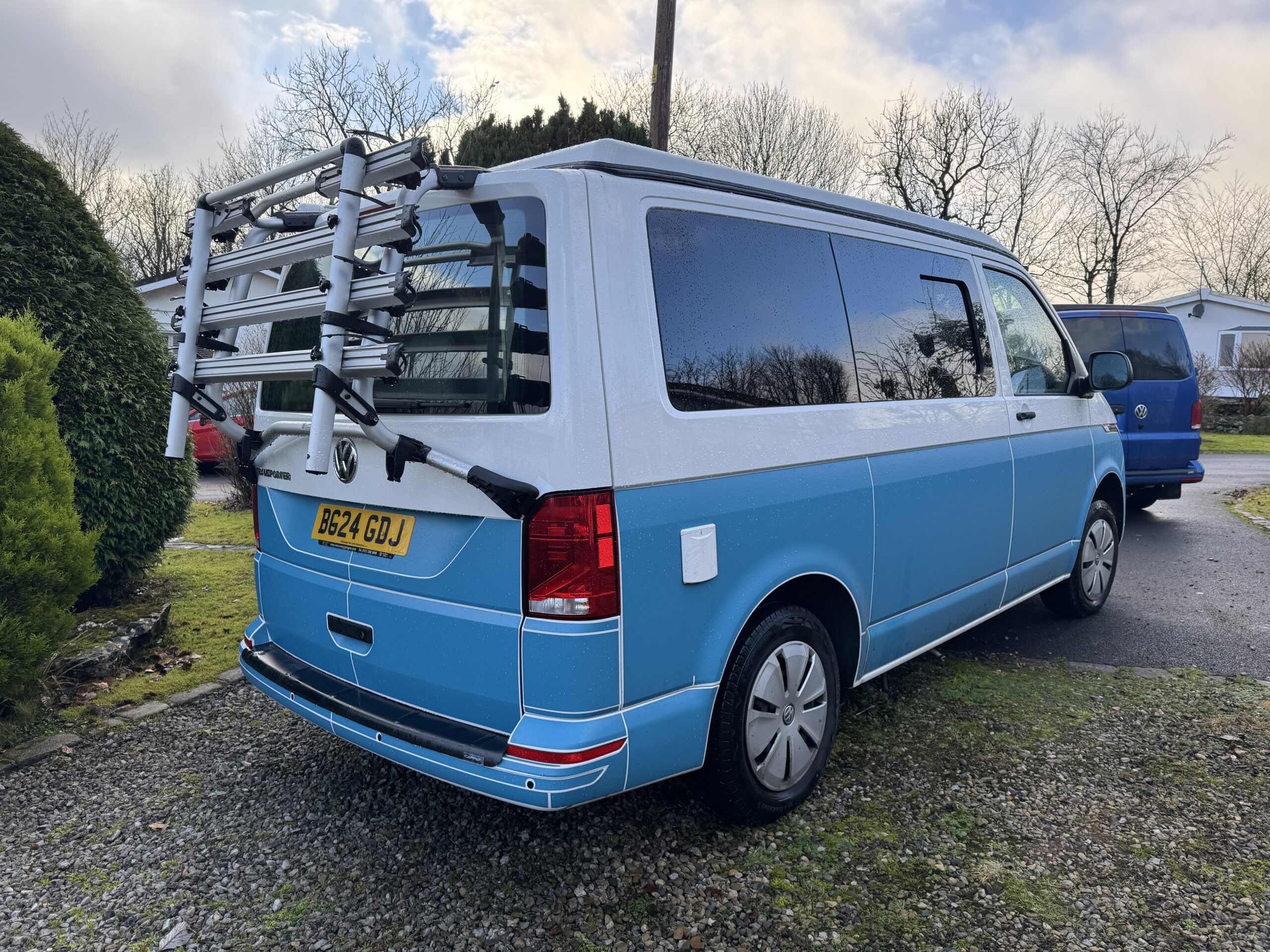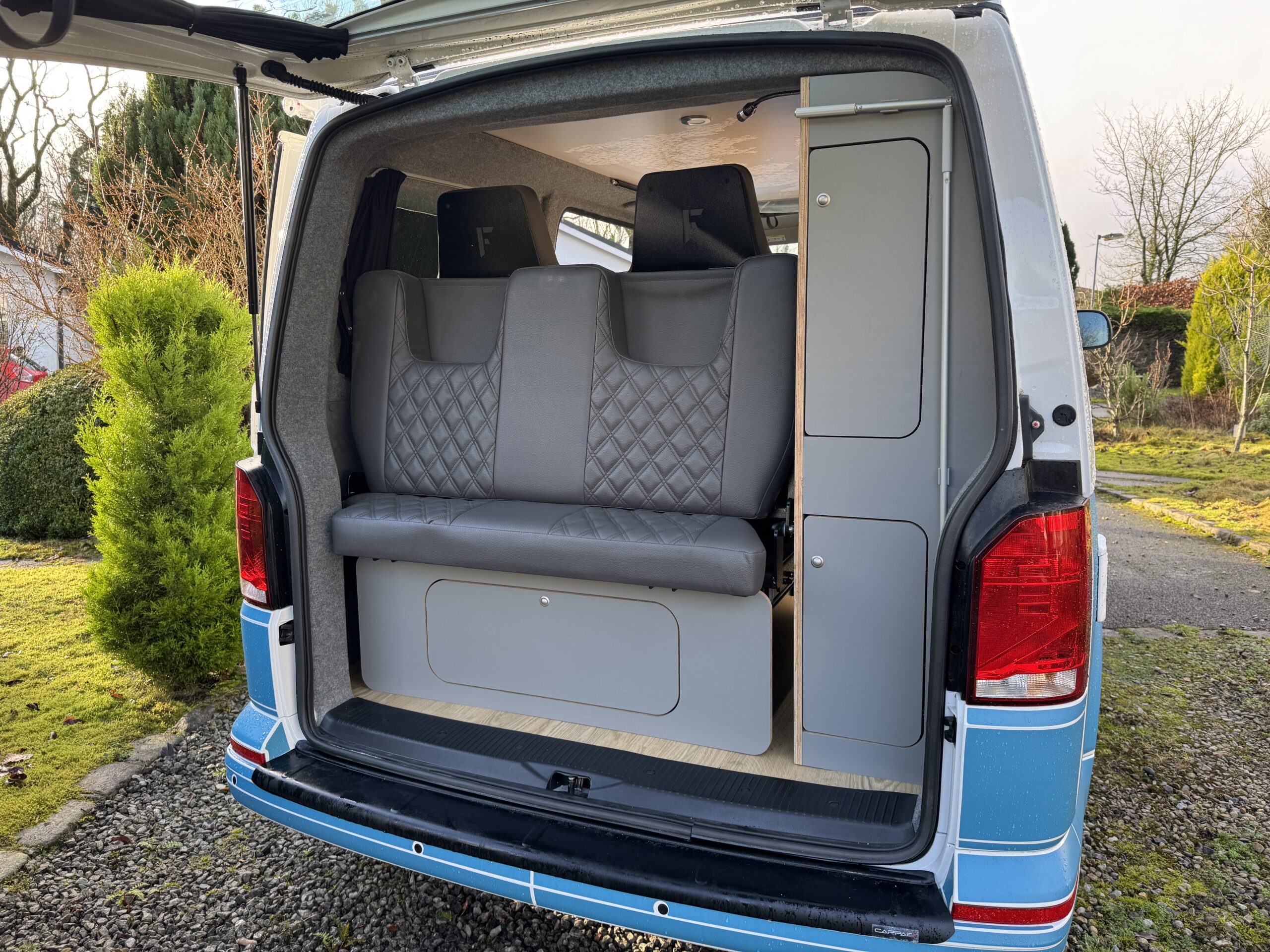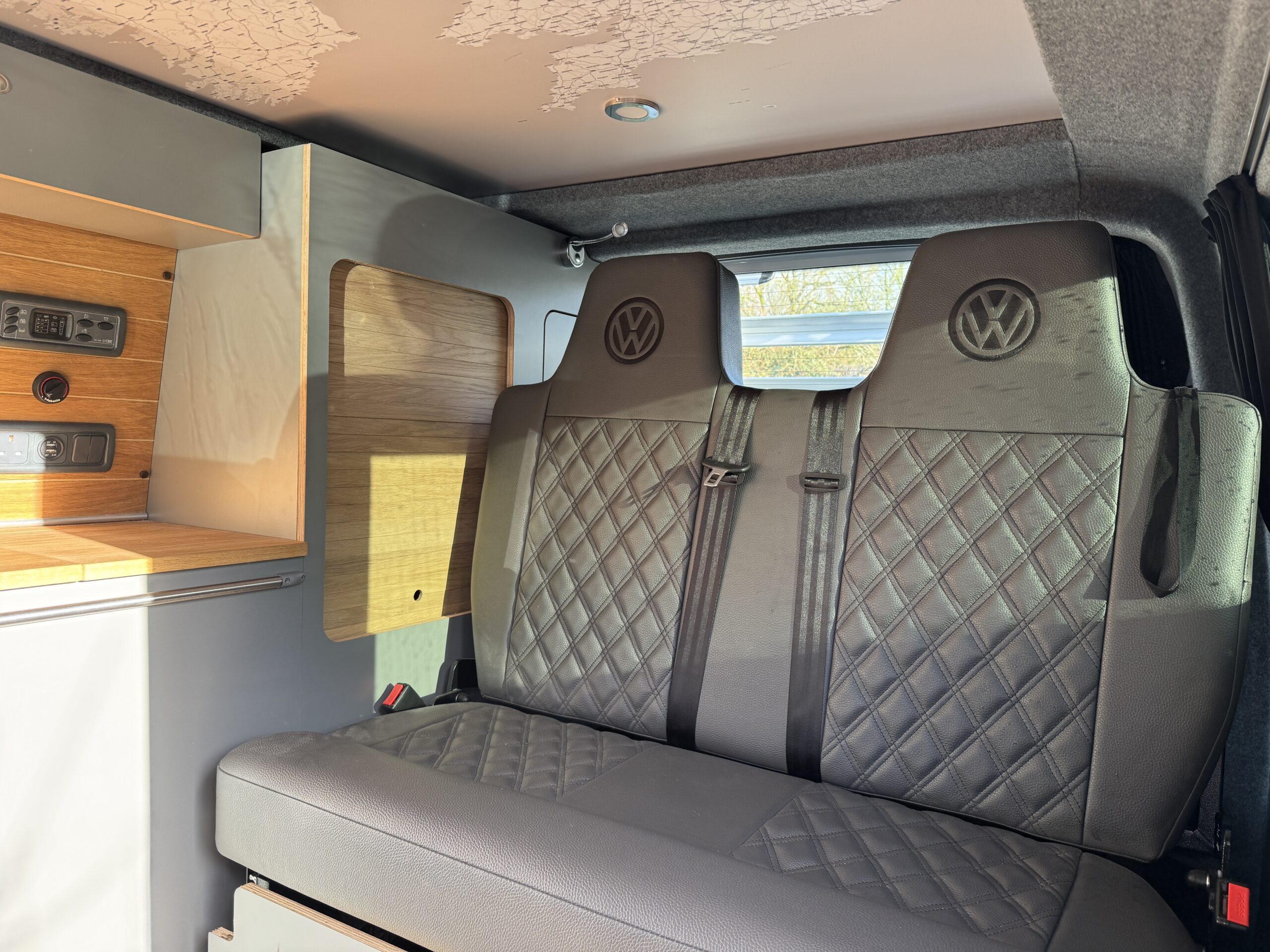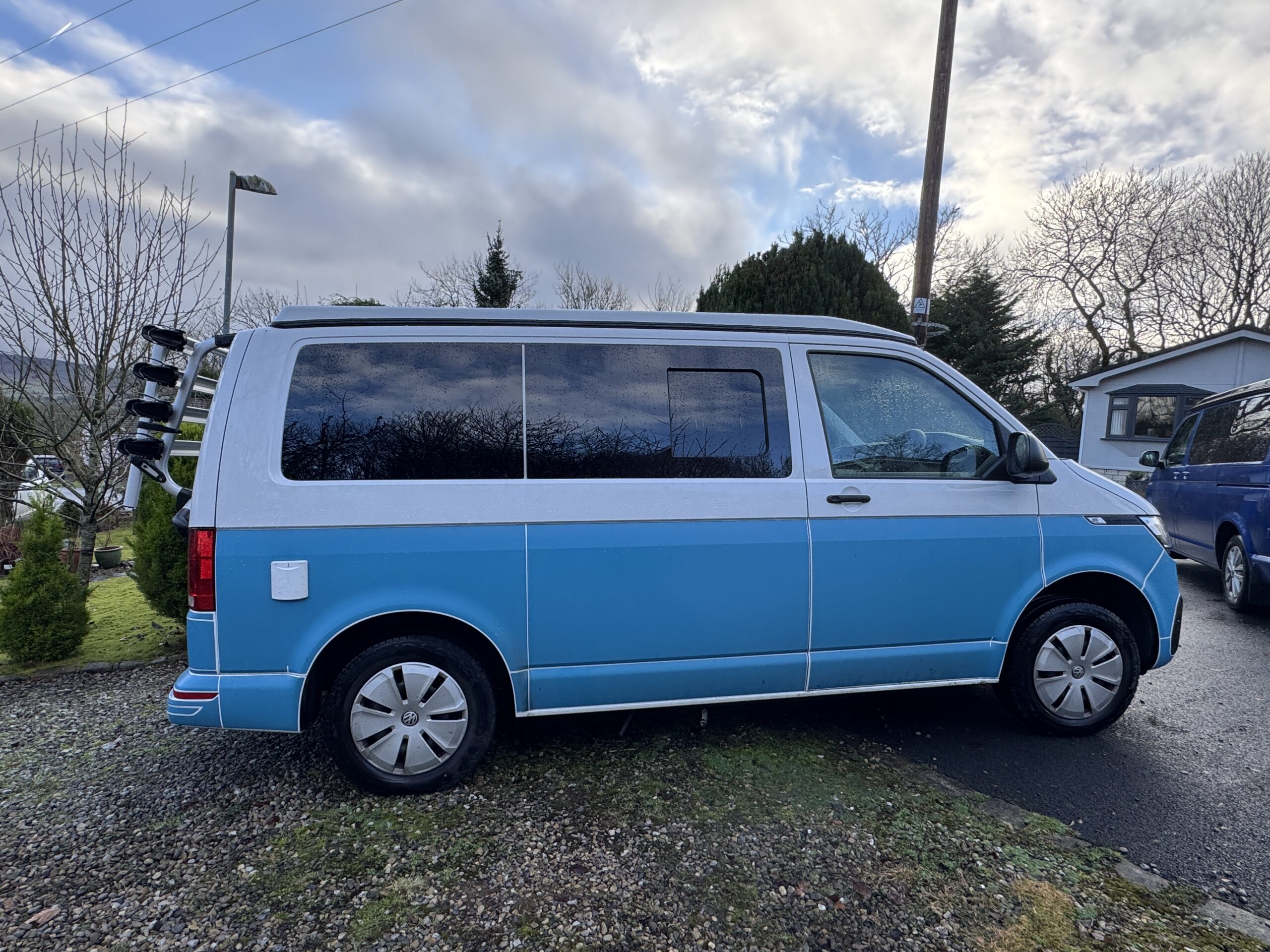 Brand new 2024 T6.1 Startline with business pack campervan 150BHP. This is a ‘Retro style’ Conversion by Goat Roadtrip with tailgate, pop-top roof, leather effect seats (seats 4 in total with seatbelts) , swivel captain’s passenger seat, rock ‘n’ roll bed, roof-bed, scenic opening canvas, webasto diesel heater, double gas hob, fridge/freezer, Smev 9222 sink, leisure battery, solar panel, 240V electric hook-up, removable table, and fresh water bottle tank with electric pump. The exterior is candy white with a head-turning amazing wrap on the lower half. You can even swap out the wrap for another colour in the future or make it completely white again! The interior is matt white with real bamboo wood tops, giving that extra WOW factor. This is a top-spec conversion in a vehicle with air conditioning. Full Service History. Delivery miles.